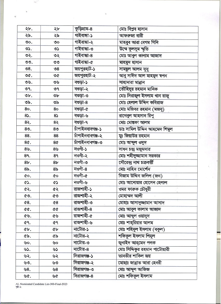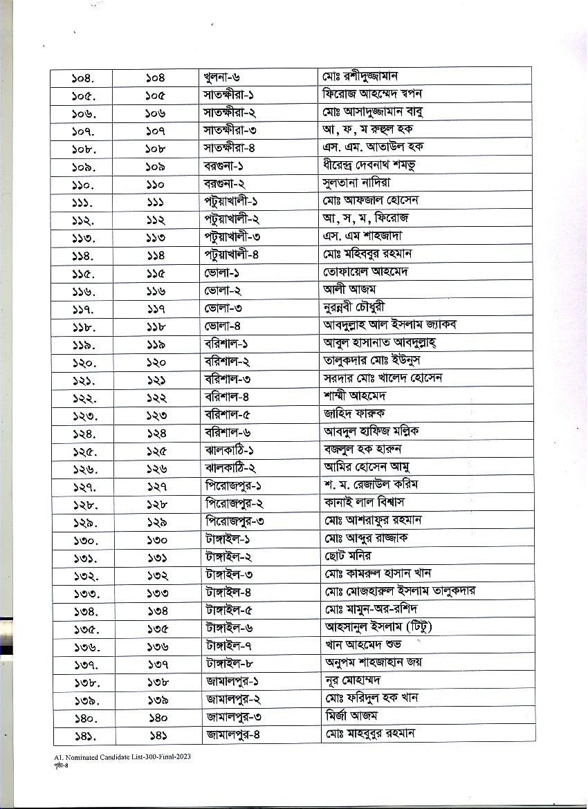 এতে বর্তমান সংসদ সদস্যদের মধ্যে বাদ পড়েছেন বেশ কয়েকজন। কুষ্টিয়া-২ ও নারায়ণগঞ্জ-৫ আসন ফাঁকা রাখা হয়েছে। এই আসন দুটিতে বর্তমানে সংসদ সদস্য যথাক্রমে জাতীয় সমাজতান্ত্রিক দল জাসদের একাংশের সভাপতি হাসানুল হক ইনু ও জাতীয় পার্টির নেতা সেলিম ওসমান।