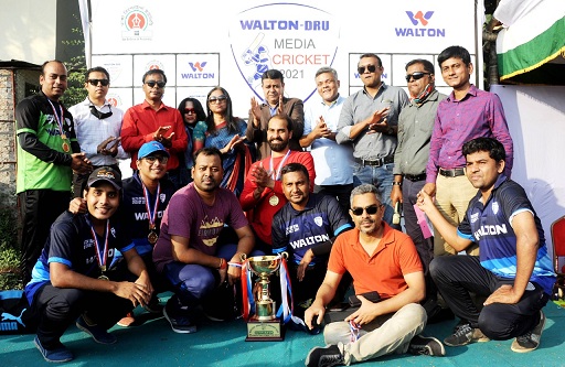ওয়ালটন-ডিআরইউ মিডিয়া ক্রিকেট-২০২১ এ চ্যাম্পিয়ন হয়েছে দৈনিক ইনকিলাব দল। টুর্নামেন্টের রানার্স আপ হয়েছে চ্যানেল আই দল। আজ বৃহস্পতিবার পল্টন আউটার স্টেডিয়ামে অনুষ্ঠিত ফাইনাল ম্যাচে ইনকিলাব ৪ উইকেটে পরাজিত করে চ্যানেল আইকে। ফাইনালে টসে জিতে ব্যাটিংয়ে নেমে ১০৮ রানের বড় টার্গেট ছুড়ে দেয় ইনকিলাবকে। দুই ব্যাটার ইয়াছিন রানা ও মাজহারুল ইসলামের দায়িত্বপূর্ণ ব্যাটিংয়ে এই রান টপকে সহজেই জয়ের লক্ষে পৌঁছে যায় ইনকিলাব। ৩ বল হাতে রেখেই জয় নিয়ে মাঠ ছাড়ে ফারুক হোসাইনের দল। ম্যান অব দ্য ফাইনাল নির্বাচিত হন ইনকিলাবের মাজহারুল ইসলাম।