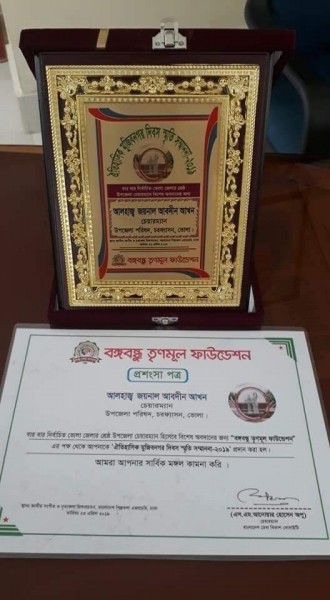 ভোলা জেলার শ্রেষ্ঠ উপজেলা চেয়ারম্যান হিসেবে সম্মাননা পেয়েছেন বারবার নির্বাচিত সৎ ও নিষ্ঠাবান ব্যক্তিত্ব শ্রদ্ধীয় অভিভাবক, চরফ্যাশন উপজেলা পরিষদের চেয়ারম্যান আলহাজ্ব জয়নাল আবদীন আখন। সম্প্রতি বঙ্গবন্ধু তৃণমুল ফাউন্ডেশনের পক্ষ থেকে ‘ঐতিহাসিব মুজিবনগর দিবস স্মৃতি সম্মাননা’ হিসেবে তাকে জেলার শ্রেষ্ঠ উপজেলা চেয়ারম্যান আখ্যায়িত করে প্রশংসাপত্র ও ক্রেস্ট প্রদান করা হয়। এসময় জয়নাল আবদীন আখনের দীর্য়াঘু ও সুস্বাস্থ্য কামনা করেন সংশ্লিষ্টরা।