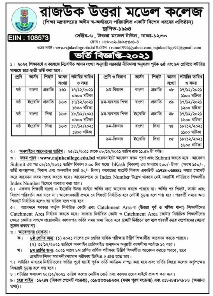 রাজউক উত্তরা মডেল কলেজে ৬ষ্ঠ ও নবম শ্রেণির নির্ধারিত আসনে প্রভাতি ও দিবা শিফটে ছাত্র-ছাত্রী ভর্তির অনলাইন আবেদন শুরু হচ্ছে আজ ২৫ নভেম্বর। বিস্তাতি জানতে নিচের বিজ্ঞপ্তি দেখুন।