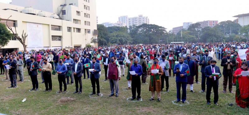জাতির পিতা বঙ্গবন্ধু শেখ মুজিবুর রহমানের জন্মশতবার্ষিকী এবং বিজয়ের সুবর্ণজয়ন্তী'র মাহেন্দ্রক্ষণকে উপলক্ষ্য করে নতুন প্রজন্মসহ দেশবাসীকে জাতির পিতার আদর্শ এবং মহান মুক্তিযুদ্ধের চেতনায় উজ্জীবিত করার মহতী প্রয়াসে বৃহস্পতিবার বিকাল সাড়ে ৪ টায় বাংলাদেশ জাতীয় সংসদের দক্ষিণ প্লাজা হতে প্রধানমন্ত্রী শেখ হাসিনা শপথ পরিচালনা করেন।