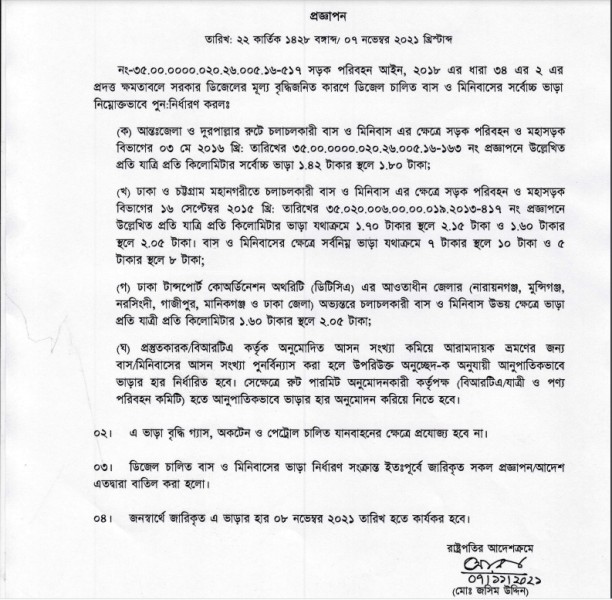 প্রজ্ঞাপনে দূরপাল্লার বাস ভাড়া প্রতি কিলোমিটারে ১ টাকা ৮০ পয়সা যেখানে আগে ছিলো ১ টাকা ৪২ পয়সা অর্থাৎ প্রতিকিলোমিটারে বাড়তি ৩৮ পয়সা বাড়ানো হয়েছে। এছাড়া মহানগরে বাসের বর্তমান ভাড়া কিলোমিটারে ১ টাকা ৭০ পয়সা, সেটা ২ টাকা ১৫ পয়সা করা হয়েছে। প্রতি কিলোমিটারে ভাড়া বেড়েছে ৪৫ পয়সা। মহানগরে মিনিবাসের বর্তমান ভাড়া প্রতি কিলোমিটারে ১ টাকা ৬০ পয়সা। সেটি বাড়িয়ে ২ টাকা ৫ পয়সা করা হয়েছে। কিলোমিটারপ্রতি ৪৫ পয়সা ভাড়া বাড়ানো হয়েছে।