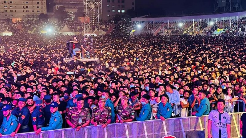 গুলিস্তানের একটি ভবনে মঙ্গলবারের বিস্ফোরণে নিহতদের প্রতি শ্রদ্ধা জানাতে ঢাকার আর্মি স্টেডিয়ামে এক মিনিট নীরবতা পালনের মধ্য দিয়ে কনসার্ট শুরু হয়।