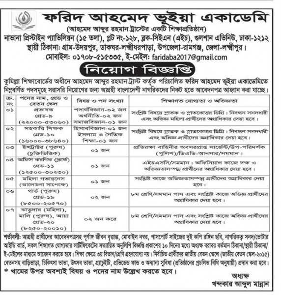 কুমিল্লা শিক্ষাবোর্ডের অধীনে পরিচালিত লক্ষীপুরের ফরিদ আহমেদ ভূইয়া একাডেমিতে বিভিন্ন পদে লোক নিয়োগ করা হবে। আগ্রহীরা আবেদনের জন্য নিচের বিজ্ঞপ্তি দেখতে পারেন।