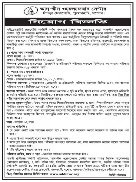 আদ্-দ্বীন ওয়েলফেয়ার সেন্টার পল্লী কর্ম-সহায়ক ফাউণ্ডেশনের আর্থিক সহযোগিতায় দেশের বিভিন্ন অঞ্চলে কমিউনিটি হেলথ এণ্ড মাইক্রোফাইনান্স কর্মসূচিতে সহকারী শাখা ব্যবস্থাপক ও সুপারভাইজার পদে লোক নিয়োগ করা হবে। বিস্তারিত জানতে নিচের বিজ্ঞপ্তি দেখুন।
