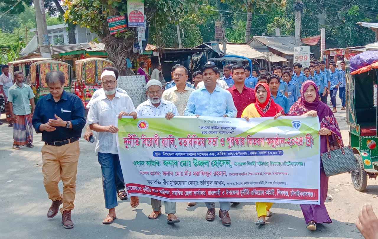 চাঁপাইনবাবগঞ্জের শিবগঞ্জে দুনীর্তি বিরোধী র্যালি, বিভিন্ন প্রতিযোগীতায় অংশগ্রহনকারীদের মধ্যে পুরুষ্কার বিতরনী ও আলোচনা সভা অনুষ্ঠিত হয়েছে। বুধবার সকালে উপজেলা পরিষদ চত্তর থেকে একটি দুনীর্তি বিরোধী র্যালি শেষে আলোচনাসভা এবং বিভিন্ন প্রতিযোগীতায় অংশগ্রহন কারীদের মধ্যে বিজয়ীদের পুরুষ্কার বিতরন করা হয়।