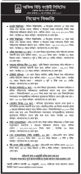 কর্মকর্তা-কর্মচারীসহ ১০টি পদে বেশ সংখ্যক লোক নিয়োগ দেবে আকিজ বিড়ি ফ্যাক্টরি লিমিটেড। বিস্তারিত জানতে নিচের বিজ্ঞপ্তি দেখতে পারেন।