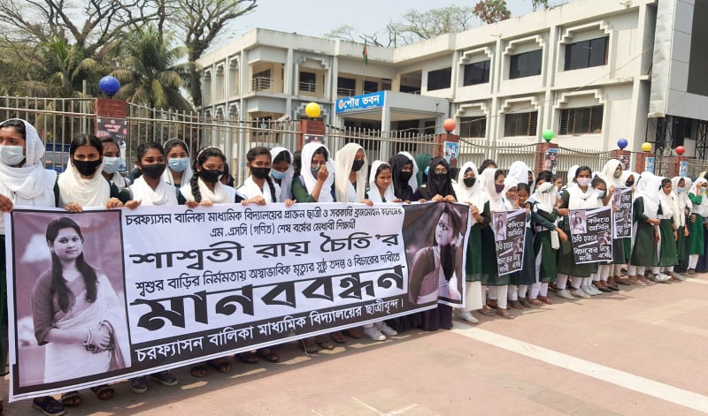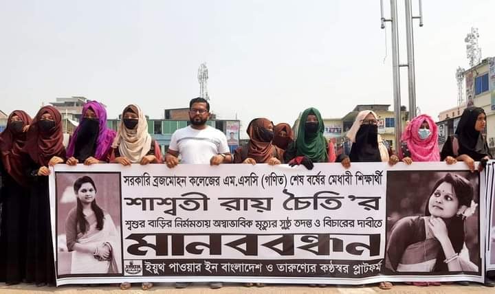 ভোলার চরফ্যাশনে গৃহবধূ শাশ্বতী রায় চৈতীর অনাকাঙ্ক্ষিত মৃত্যুর সুষ্ঠু তদন্ত ও দৃষ্টান্তমূলক শাস্তির দাবিতে বিভিন্ন সামাজিক সংগঠন এবং শিক্ষা প্রতিষ্ঠানের ব্যানারে বিক্ষোভ সমাবেশ ও মানববন্ধন অনুষ্ঠিত হয়েছে৷