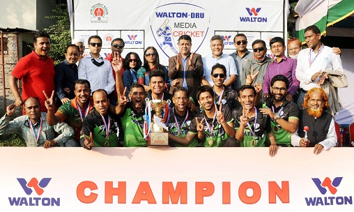 ওয়ালটন-ডিআরইউ মিডিয়া ক্রিকেট-২০২১ এ চ্যাম্পিয়ন হয়েছে দৈনিক ইনকিলাব দল। টুর্নামেন্টের রানার্স আপ হয়েছে চ্যানেল আই দল। আজ বৃহস্পতিবার পল্টন আউটার স্টেডিয়ামে অনুষ্ঠিত ফাইনাল ম্যাচে ইনকিলাব ৪ উইকেটে পরাজিত করে চ্যানেল আইকে। ফাইনালে টসে জিতে ব্যাটিংয়ে নেমে ১০৮ রানের বড় টার্গেট ছুড়ে দেয় ইনকিলাবকে। দুই ব্যাটার ইয়াছিন রানা ও মাজহারুল ইসলামের দায়িত্বপূর্ণ ব্যাটিংয়ে এই রান টপকে সহজেই জয়ের লক্ষে পৌঁছে যায় ইনকিলাব। ৩ বল হাতে রেখেই জয় নিয়ে মাঠ ছাড়ে ফারুক হোসাইনের দল। ম্যান অব দ্য ফাইনাল নির্বাচিত হন ইনকিলাবের মাজহারুল ইসলাম।