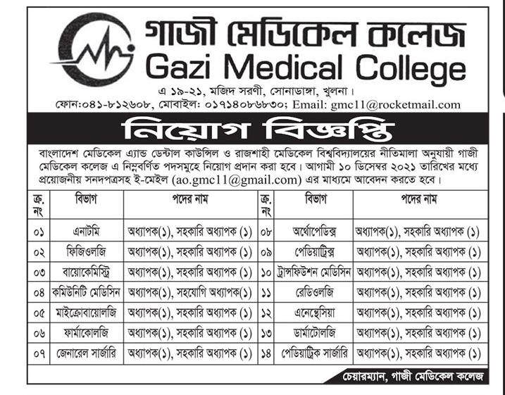 খুলনায় অবস্থিত গাজী মেডিকেল কলেজ হাসপাতালে গুরুত্বপূর্ণ ১৪ টি পদে লোক নিয়োগ দেওয়া হবে। বিস্তারিত জানতে নিচের বিজ্ঞপ্তি দেখতে পারেন।